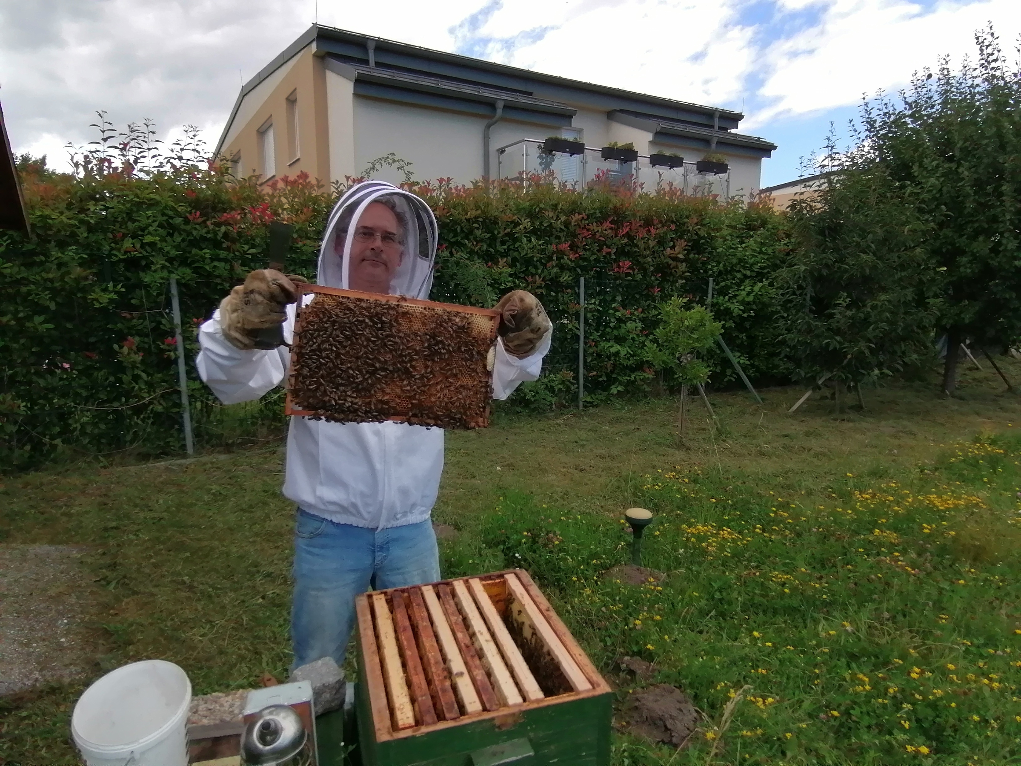 Durch den Besuch eines Imkerkurses, und Mittels eines Paten. Und natürlich auch durch Selbststudium. Im Jahr 2012 bin ich mit meiner Frau auf der Terrasse gesessen und haben gemerkt, dass etwas fehlt....... Nach einigen Überlegen merkten wir das Summen der Bienen fehlte. Worauf wir sofort einen Imkerkurs machten.
