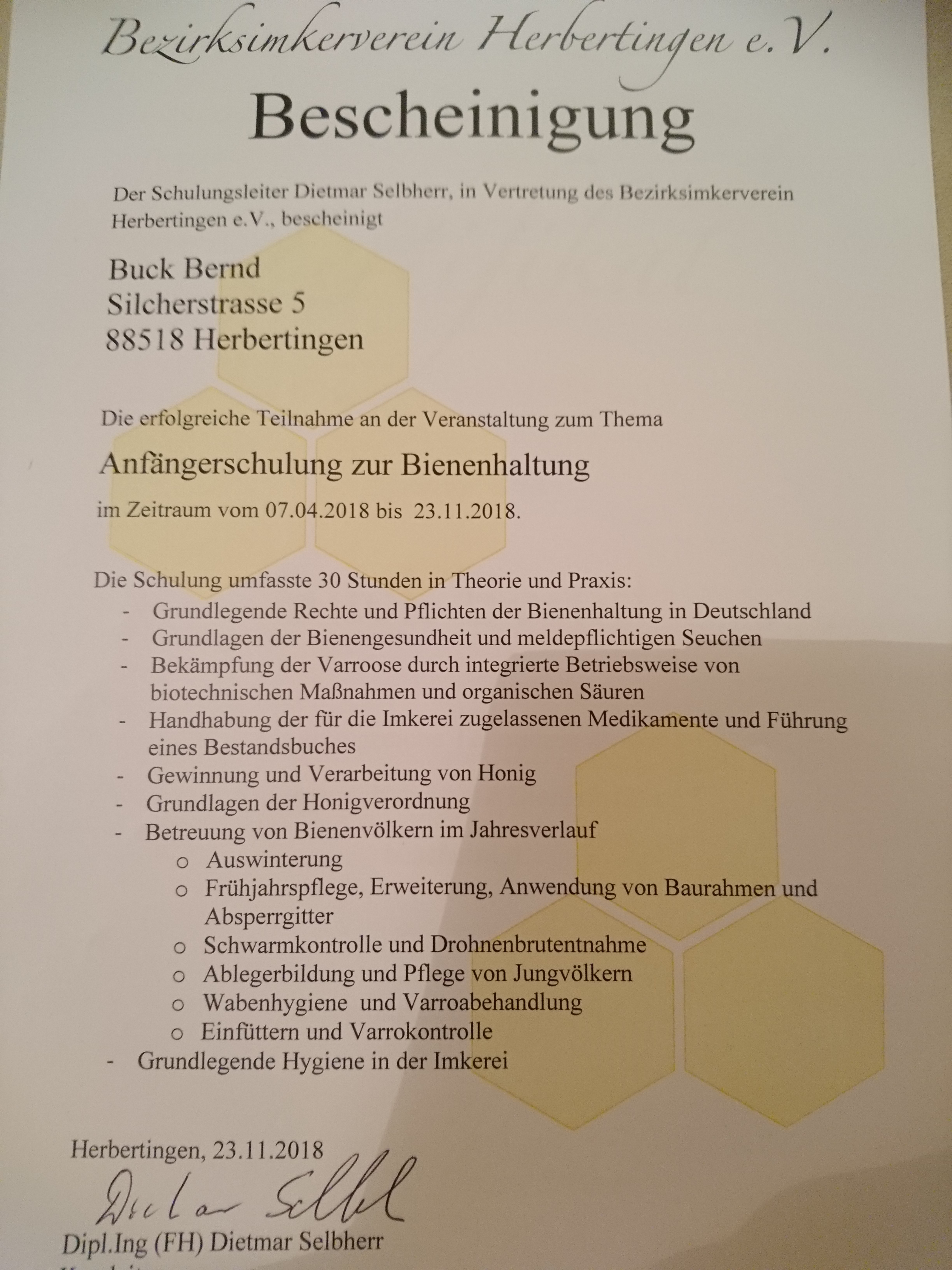 Ich habe einen Imkerkurs gemacht, habe aber auch viel aus dem Internet und vorallem ansprechenden Literatur gelesen. Was ich auch weiterhin machen werde! Mein Pate gibt mir viele hilfreiche Tipps und betreut mich weiterhin. Ich bin Musiker und zum Ausgleich habe ich mir dieses Hobby ausgesucht. Mein Nachbar ist Imker und zugleich mein Imkerpate. Es macht mir riesen Spaß diese Welt der Bienen kennenzulernen. Meine ganze Familie freut sich mit mir, dieses Jahr unseren eigenen Honig zu ernten.
