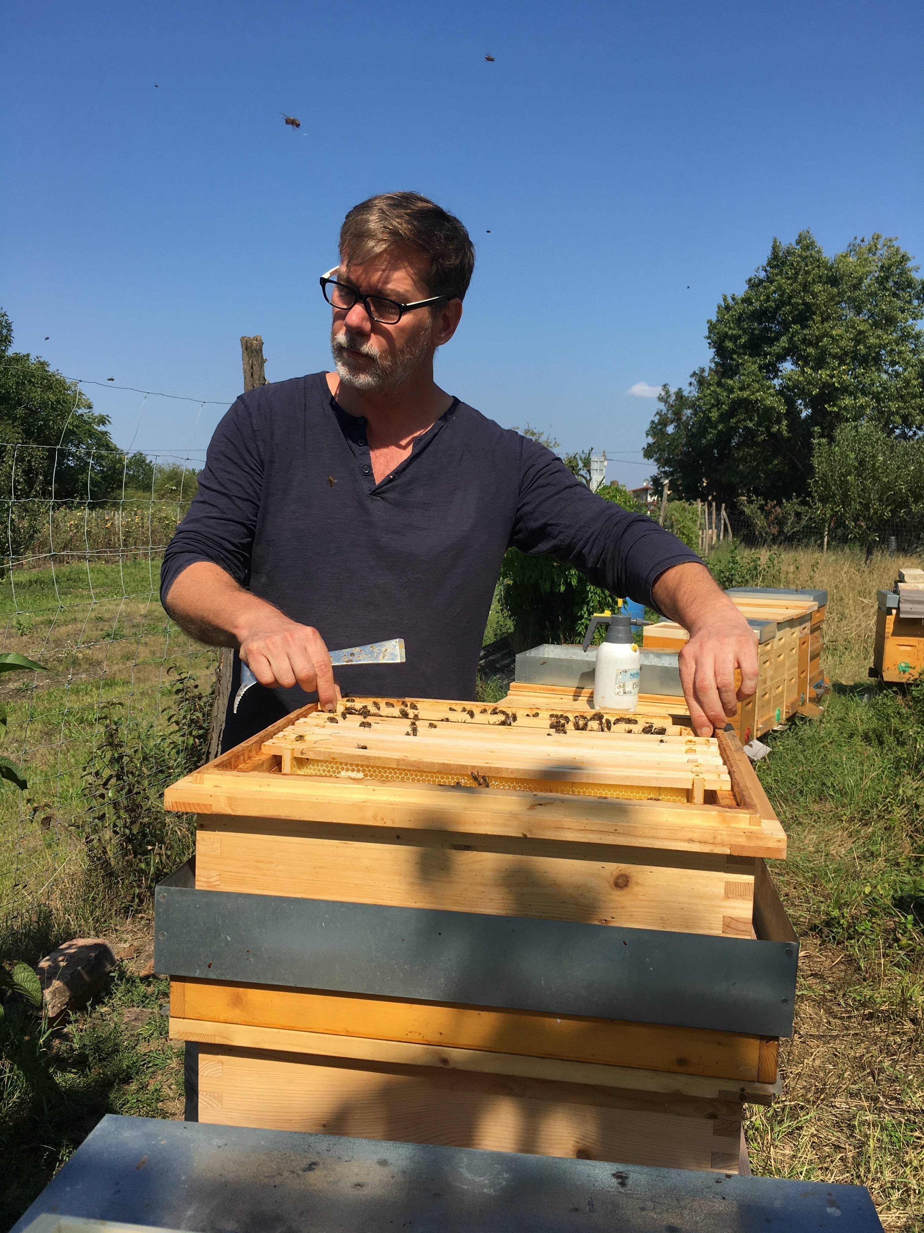 Ich bin Josef Bacher aus Floridsdorf und habe 2013 begonnen, zu imkern. Ich mache schon lange Computerarbeit, genauer gesagt Grafikdesign und Videos. In den letzten zehn Jahren ist die Sehnsucht gewachsen, irgendetwas in der Natur zu machen, im Grünen mit der Natur. Also ich war auf der Suche nach einem Garten, um zu garteln oder einem anderen Hobby. Auf Facebook habe ich dann gesehen, dass ein Freund von mir ein Foto gepostet hat von seinen neuen Bienen am Balkon. Das hat mir total getaugt. Ich habe begonnen, darüber zu recherchieren, nachzulesen und auch bald meinen ersten Imkerkurs gebucht in der Wiener Imkerschule. Dann hat es mich gepackt, das Bienenfieber, und seither nicht mehr losgelassen. Ich habe mit zwei Völkern begonnen, bald waren es zehn Völker, dann 30. Heute sind es um die 45 Völker. Vor ein paar Jahren habe ich dann auch mit der Königinnezucht begonnen und bin inzwischen Mitglied des Zuchtverbands ZAC (Zentrale Arbeitsgemeinschaft d. Carnicazüchter). Es steckt sehr viel Leidenschaft drin und sehr viel Liebe. Das taugt mir total. Es ist ein guter Gegenpol zu meiner Computerarbeit, zu meinem eigentlichen Beruf. Ich habe an der Wiener Imkerschule meinen Einführungskurs besucht. Damals, vor dem Wechsel der Schulleitung, unterschieden sich die Meinungen der Vortragenden sehr voneinander. Ich habe damals nach Bauchgefühl entschieden, wem ich glaube oder nicht. Danach habe ich an der Imkerschule Warth in Niederösterreich meine Ausbildung zum Imker-Facharbeiter absolviert und eine konkrete Betriebsweise kennengelernt an der ich mich orientieren konnte. In den folgenden Jahren hab ich dann mein Ding draus gemacht. Das ist wichtig für die Neulinge. Wenn du eine Richtung kennenlernst, kannst du danach selbst entscheiden, wie und was du machen möchtest.