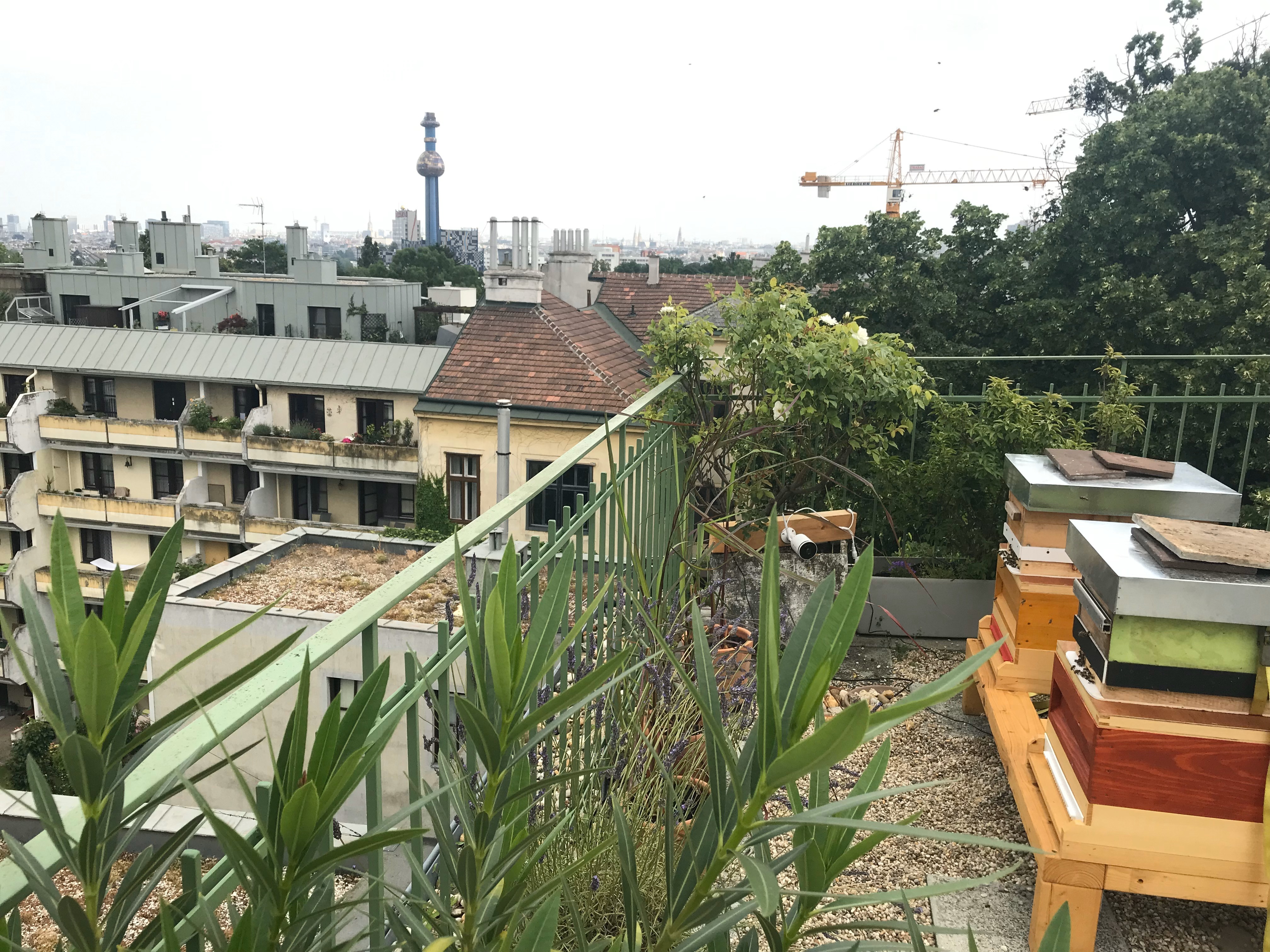 Ursprünglich hab ich mit Selbststudium begonnen, dann habe ich noch einen Imker-Kurs belegt. Ich bin 52 Jahre alt, bin seit 20 Jahren verheiratet und habe zwei erwachsene bzw. fast erwachsene Töchter. Neben dem Imkern bin ich Consultant und Projektleiter im Banken-IT Umfeld. Unsere Bienen stehen einen Stock über uns, im Dachgarten meiner Schwiegermutter.