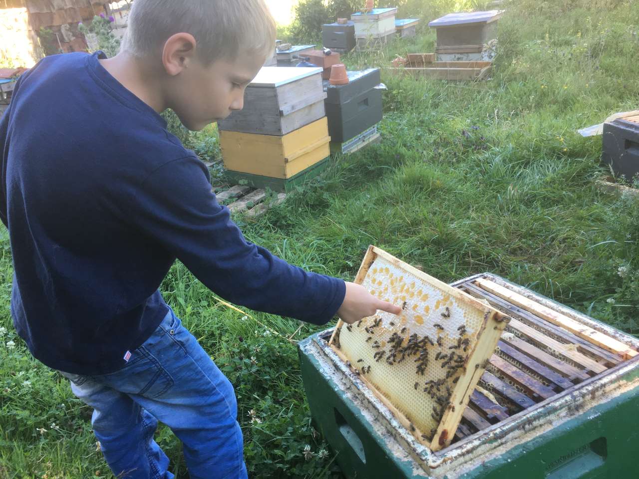 In der Beute befinden sich mindestens drei-vier Brutwaben mit großer Brutfläche, Waben in Produktion, Mittelwände und Futterwaben.