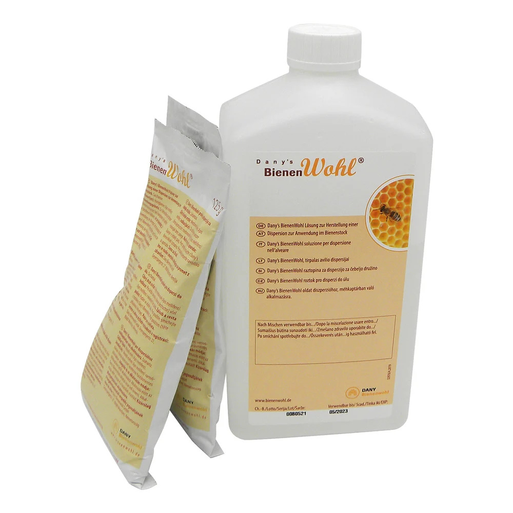 Dany’s Bienenwohl Pulver und Lösung zur Herstellung einer Dispersion (39,4 mg/ml) zur Anwendung im Bienenstock.