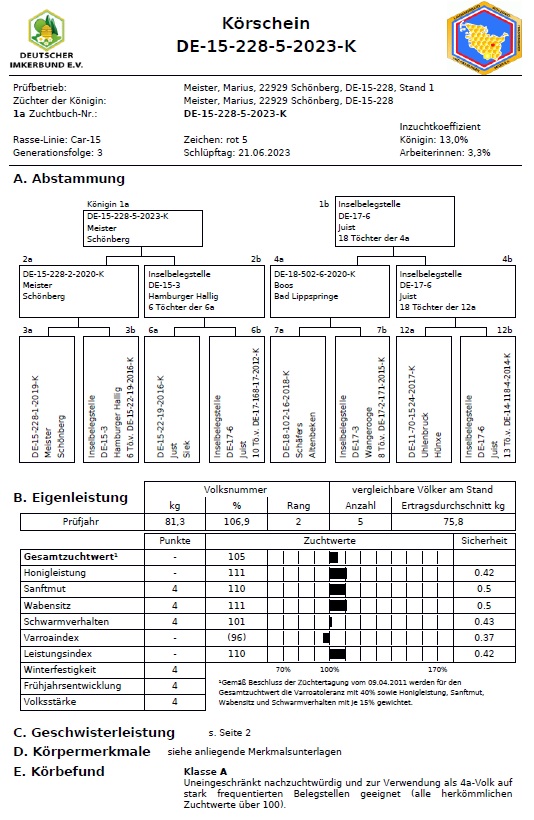 Dieses Sklenar-Biene hat über viele Jahre hinweg immer wieder mal die Leistungsprüfung am Prüfstand der Segeberger Imkerschule gewonnen. Zuletzt stand im Leistungsjahr 2022 eine Tochter von der DE-15-228-2-2020-K (und somit eine Schwester von der DE-15-228-5-2023-K) ganz oben auf dem Treppchen. Durch meine Tätigkeit als BSV habe ich den Sanftmut meiner Bienen nur noch mehr zu schätzen gelernt. Hier kann wirklich ohne Schutz und minimalem Einsatz von Rauch problemlos geimkert werden.