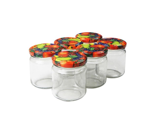 Praktische Einkochgläser mit Schraubdeckel mit Obstdekor. Ideal für ihr selbstgemachtes Marmelade.