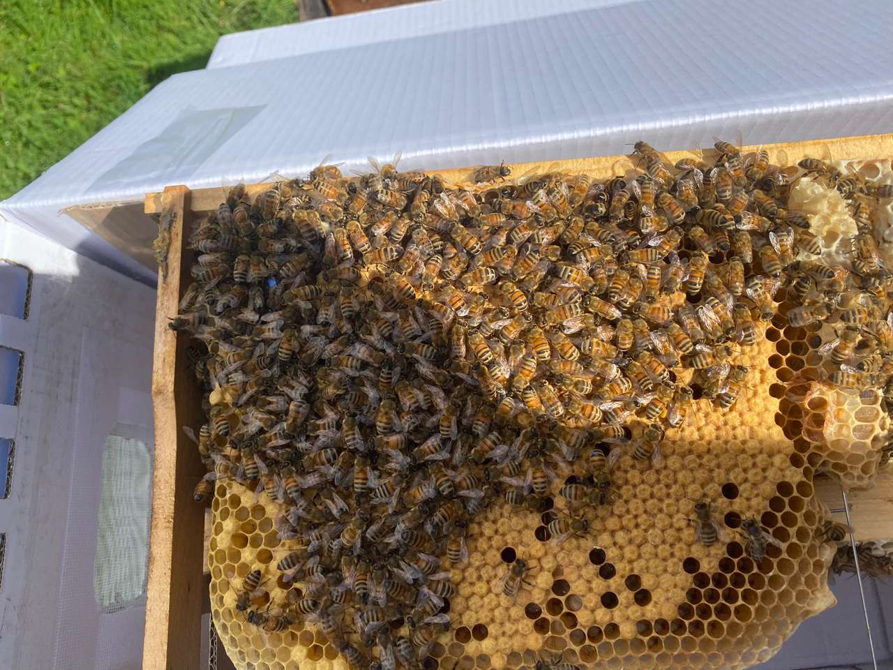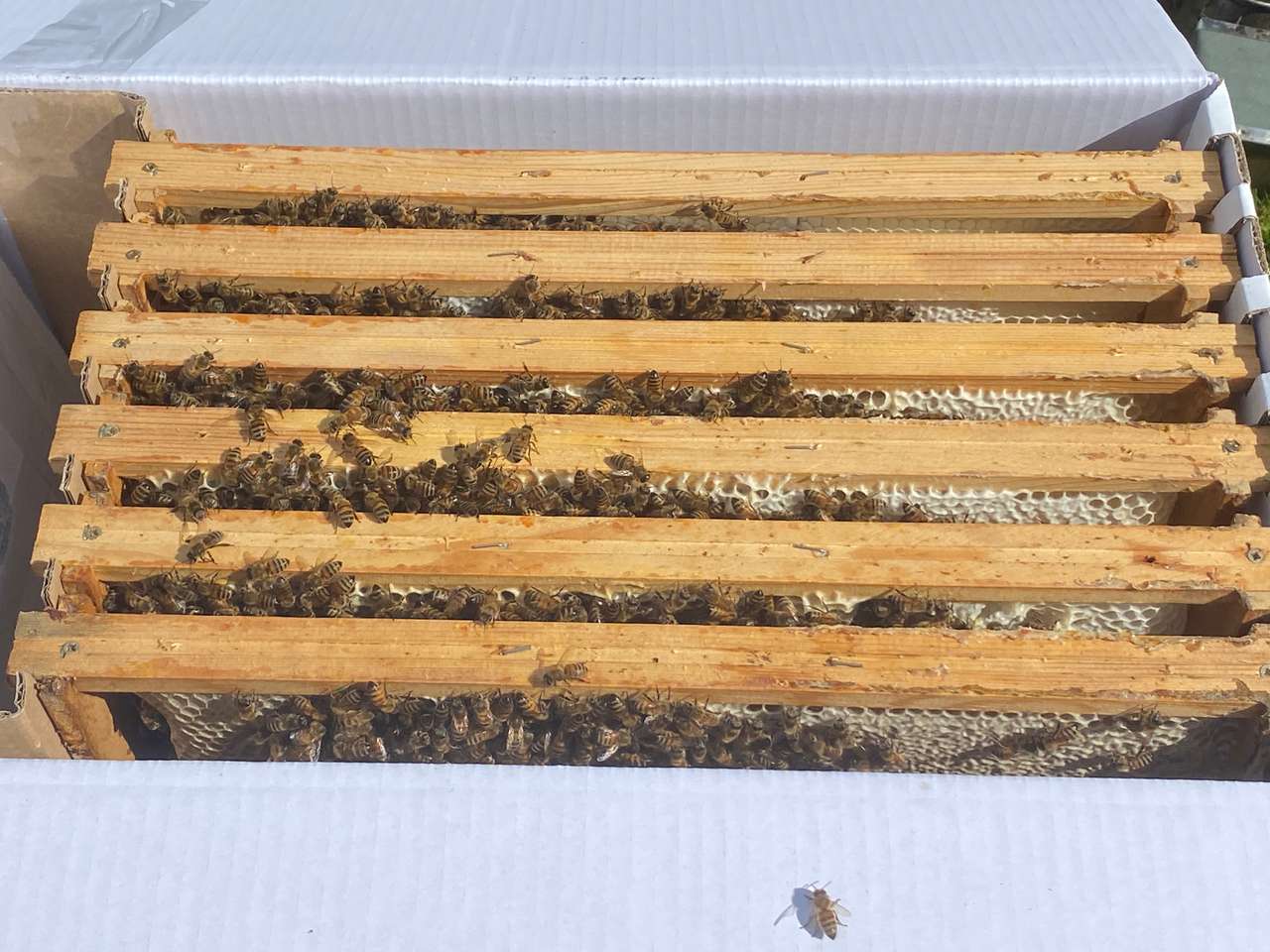 Wir bieten hier einen 6-Waben-Ableger auf Naturbau mit sanftmütiger Buckfast Königin an. Die Bienen bauen die Waben selbst ohne Mittelwand aus.
