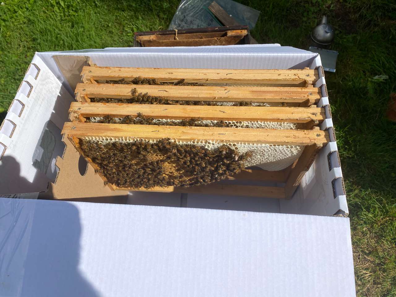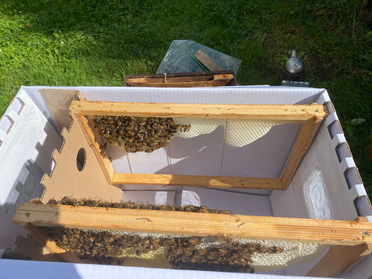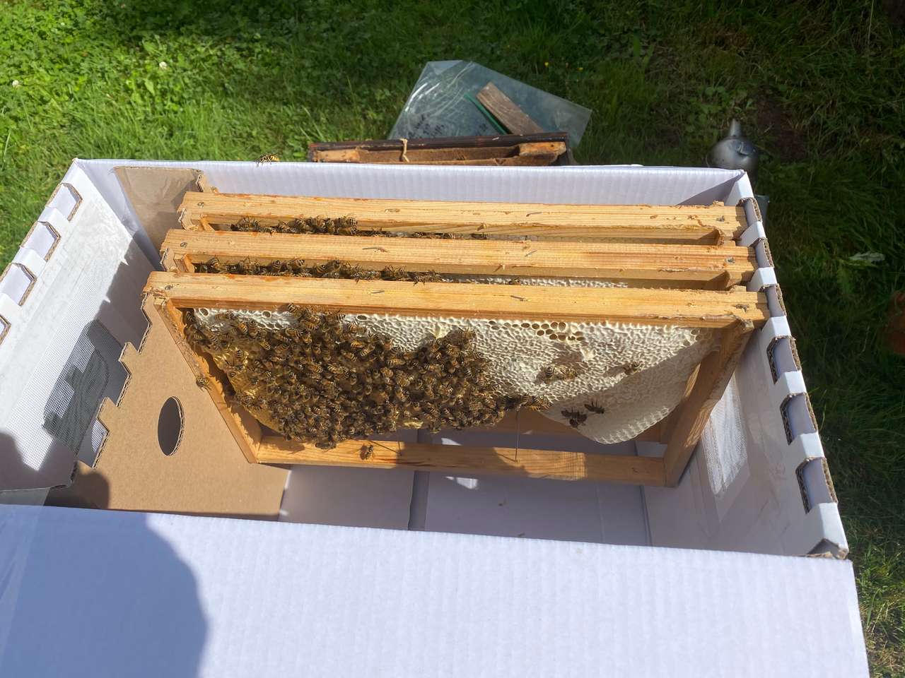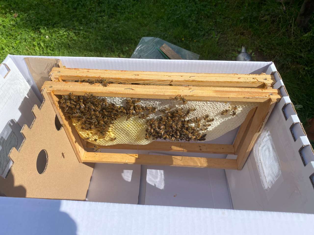 Es befinden sich mindestens zwei/drei Brutwaben, zwei/drei Waben in Produktion und eine Futterwabe im Ableger.